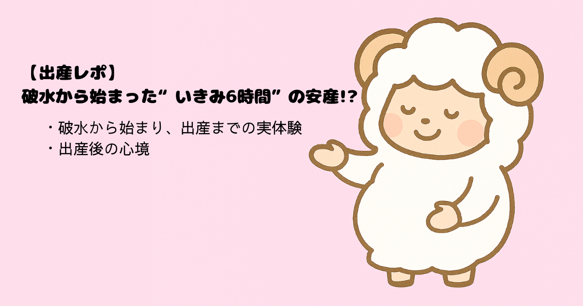 体験談 【出産レポ】破水から始まった“いきみ6時間”の安産!?(39w2d) この記事でわかること破水から始まり、出産までの実体験出産後の心境ゆめひつじこんにちは。0歳の息子とバタバタな毎日を送っている、ゆめひつじです。今回は、私の「初めての出産」について書こうと思います。私は破水スタート→普通分娩という流れで出産し... 2025.08.28 体験談